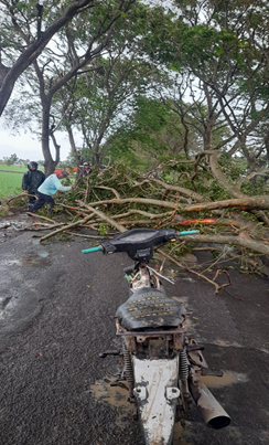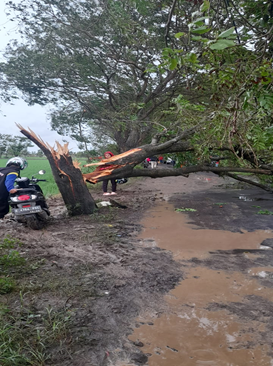“Kami langsung bersama-sama mengangkat batang pohon supaya pengendara yang mau bekerja jangan terhalang, kebetulan tim BPBD sudah ada yang kesini membawa mesin potong, ahirnya ini hampir sudah bisa dilalui pengendara khususnya pemotor”.