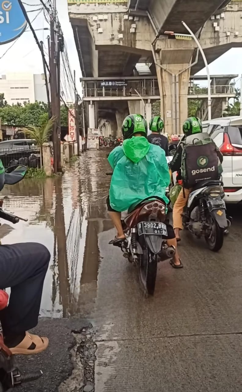 Terlihat dalam gambar Sejumlah pengendara, terutama pengemudi ojek online, tampak kesulitan melintas karena sebagian jalan tergenang air. Beberapa pengendara memilih berjalan perlahan di sisi jalan yang tidak terlalu dalam genangannya untuk menghindari mogok.