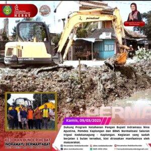 SORANA.CO.ID-INDRAMAYU JAWA BARAT:Program Ketahanan Pangan yang digagas Bupati Indramayu Nina Agustina diapresiasi oleh Pemerintah Desa (Pemdes) Kaplongan, Kecamatan Kedokan Bunder, dan pihak Balai Besar Wilayah Sungai Cimanuk – Cisanggarung (BBWS Cimancis) dengan melaksanakan normalisasi saluran Kedokanagung – Kaplongan.