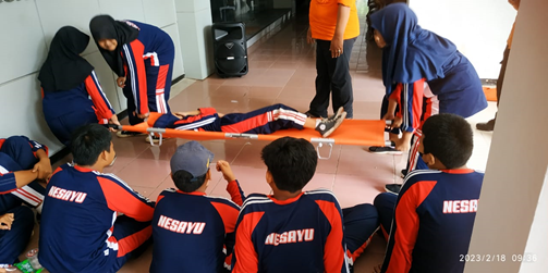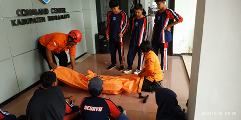 Kepala Pelaksana BPDB Indramayu, Dadang Oce Iskandar melalui Staf Penanggulangan Bencana, Ismail, menerangkan simulasi tentang cara dan penanganan korban menggunakan Tandu serta Kantung Jenazah.Materi diberikan dengan teknik praktik dan interaktif tanya jawab. Bagi siswa yang dapat menjawab pertanyaan dari pemateri akan mendapatkan topi cantik Indramayu Bermartabat (Bersih, Religius, Maju, Adil, Makmur dan Hebat).