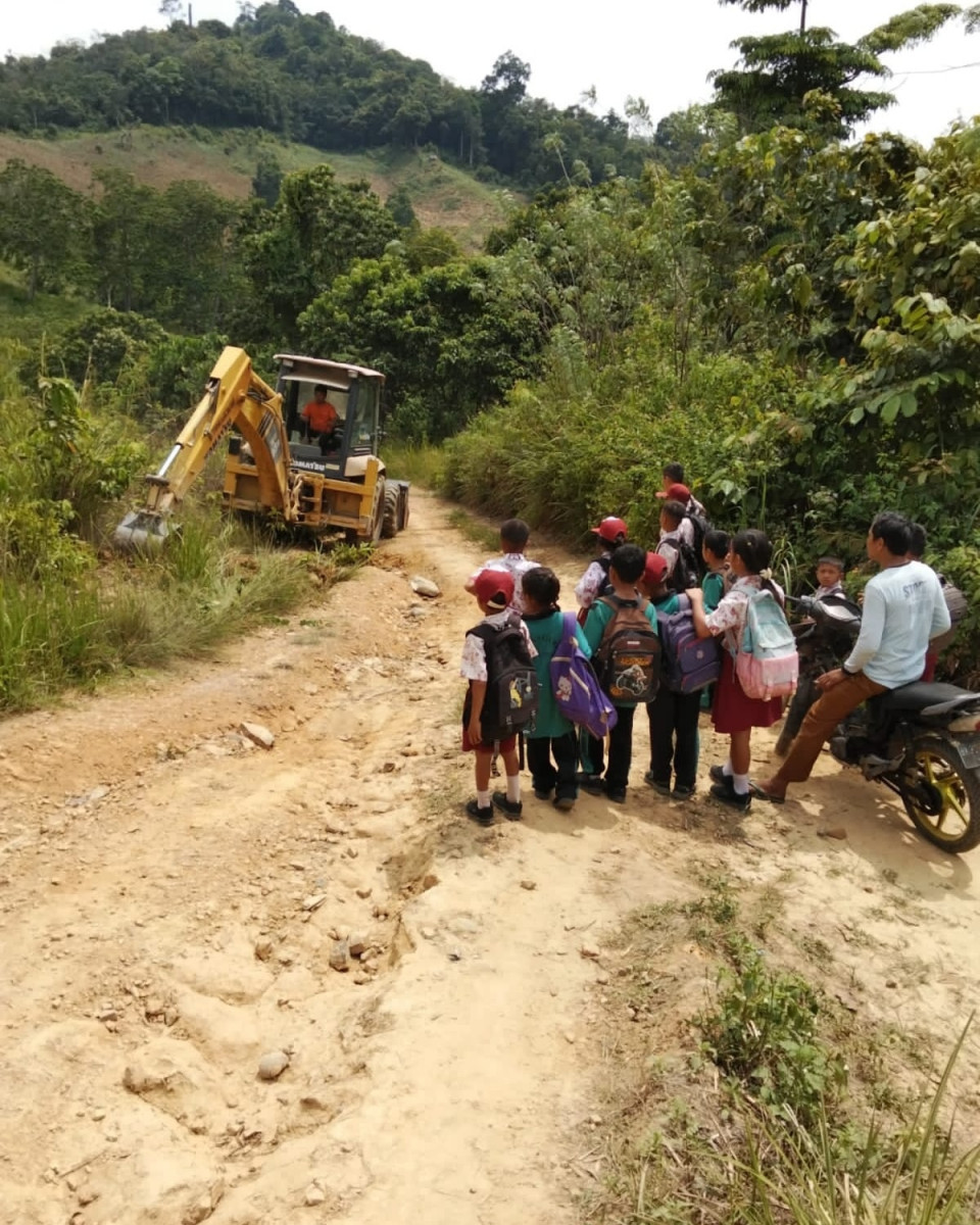 Tampak dalam gambar generasi bangsa anak sekolah antusias lihat perbaikan jalan (foto:https://dairikab.go.id/