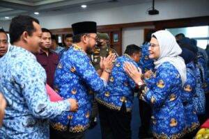 SORANA.CO.ID-INDRAMAYU JAWA BARAT:Ratusan Kepala desa atau kuwu Angkatan 138 se-Kabupaten Indramayu. Berkesempatan bersilaturahmi dan halal bihalal dengan Bupati Indramayu Nina Agustina yang didampingi sejumlah kepala perangkat daerah terkait, di Aula Bank Bjb Cabang Indramayu, Senin (22/5/2023).Dalam sambutannya Bupati Indramayu Nina Agustina menyampaikan sejumlah pesan kepada para kepala desa atau kuwu angkat 138 ini.