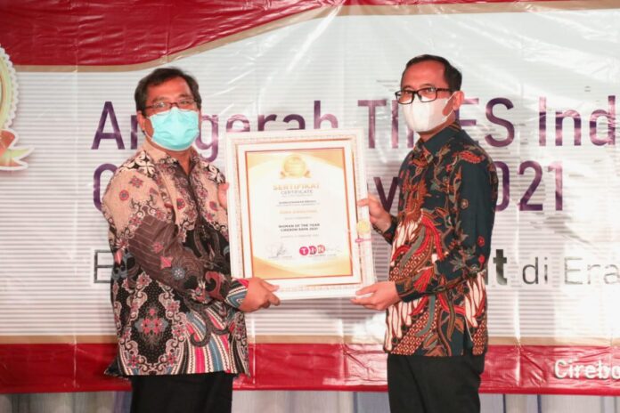 CEO TIMES Indonesia Khoirul Anwar menyerahkan langsung Anugerah TIMES Indonesia Women of The Year untuk Bupati Indramayu Nina Agustina Da’i Bachtiar yang diwakili Kepala Dinas Komunikasi dan Informatika (Diskominfo) Indramayu Aan Hendrajana dengan disaksikan langsung oleh para tamu undangan.