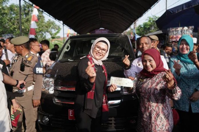 Penyerahan mobil siaga diserahkan langsung Bupati Indramayu Nina Agustina kepada Kuwu Rambatan Wetan Tumi’ah yang disaksikan ratusan warga yang yang memenuhi halaman kantor desa setempat bersamaan dilaksanakannya kegiatan sedekah bumi, Rabu (1/11/2023).