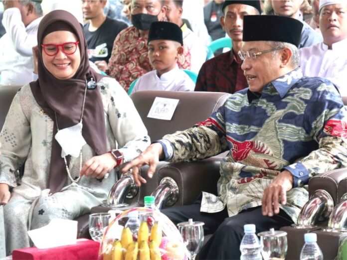 Mustasyar Pengurus Besar Nahdatul Ulama (PBNU) Prof. Dr. KH. Said Aqil Siradj, MA. didampingi Bupati Indramayu Nina Agustina Da’i Bachtiar menghadiri Haul ke-119 Kyai Syakir dan Sepuh Wotgalih bertempat di Desa Singajaya, Kecamatan Indramayu, Kabupaten Indramayu, Sabtu (21/5/2022).