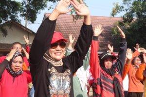 Bupati Nina Agustina yang tiba di halaman Kantor Desa Mekarsari langsung mengambil posisi barisan bersama dengan ratusan masyarakat yang didominasi oleh ibu-ibu untuk langsung melaksanakan senam pagi.