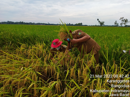 Camat Bangodua Raden Mas Wahyu Adhiwijaya S.STP M.Si,dan Kepala Desa (Kuwu) Karangggetas H Nurwedi AMK dalam kunjungan kerja panen perdana musim tanam rendeng sebagai percontohonan bersama petani Cakra di blok Desa, kelompok Tani Langgeng Mayeng lahan luas 1ha,ukuran 2,5 X2,5 m hasil yang di dapat 4,87kg ( produktifitas 77,92 kuintal/ ha,hasil petani padi Desa karanggetas kecamatan Bangodua Kabupaten Indramayu Jawa Barat, Senin (21/03/2022).