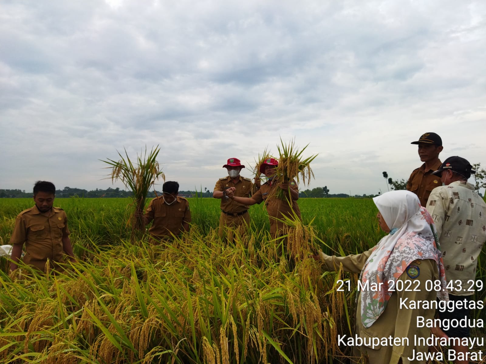 Camat Bangodua Raden Mas Wahyu Adhiwijaya S.STP M.Si,dan Kepala Desa (Kuwu) Karangggetas H Nurwedi AMK dalam kunjungan kerja panen perdana musim tanam rendeng sebagai percontohonan bersama petani Cakra di blok Desa, kelompok Tani Langgeng Mayeng lahan luas 1ha,ukuran 2,5 X2,5 m hasil yang di dapat 4,87kg ( produktifitas 77,92 kuintal/ ha,hasil petani padi Desa karanggetas kecamatan Bangodua Kabupaten Indramayu Jawa Barat, Senin (21/03/2022).