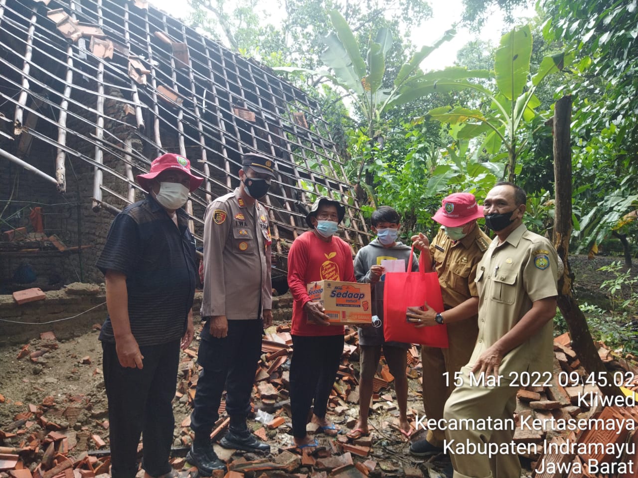 Camat Bangodua, Raden Mas Wahyu Adhiwijaya,S.STP,. M.Si.didampingi Plh Kasi Trantib kecamatan Bangodua Eko Febyanto, S.IP,Kepala Desa Beduyut Tabroni,Kapolsek Tukdana Polres Indramayu, AKP Iwa Mashadi, S.H.,M.H., bersama anggotanya pagi ini, Selasa 15 Maret 2022 sekitar pukul 09.00 Wib, mendatangi rumah warga yang roboh akibat hujan deras dan angin kencang yang terletak di Desa Beduyut Blok Muaragawe Rt. 07 Rw. 04, Kecamatan Bangodua, Kabupaten Indramayu, Jawa Barat.