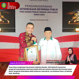 SORANA.CO.ID-INDRAMAYU JAWA BARAT:Keren dan Hebat itulah yang terus disematkan kepada Desa Cangkingan Kecamatan Kedokan Bunder Kabupaten Indramayu. Setelah dinasbihkan menjadi desa digital kini desa terbaik di Indramayu dan Jawa Barat tersebut mendapatkan anugerah dari Komisi Informasi (KI) Provinsi Jawa Barat sebagai Desa dengan Keterbukaan Informasi Publik (KIP).Prestasi tersebut merupakan torehan sejarah baru bagi desa di Kabupaten Indramayu. Pasalnya, selama ini belum ada desa yang mampu meraih prestasi sebagai desa dengan keterbukaan informasi publik terbaik dan mendapatkan anugerah dari KI.Anugerah kepada Desa Cangkingan Kecamatan Kedokan Bunder diserahkan Wakil Gubernur Jawa Barat Uu Ruzhanul Ulum di Gedung Sate, Bandung, Kamis (8/12/2022).