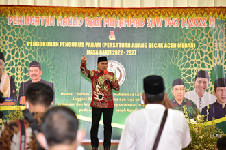 Hal ini disampaikannya saat menghadiri Peringatan Maulid Nabi Muhammad SAW 1443 H sekaligus pengukuhan pengurus Persatuan Abang Becak Aceh Medan (PABAM) periode 2022 -2027 di Gedung Aceh Sepakat Jalan Mengkara No. 57 Medan, Selasa (1/2).