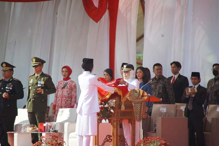 Upacara HUT Proklamasi Kemerdekaan RI Ke- 78, dihadiri Pimpinan Forkompinda, Pimpinan dan Anggota DPRD, Pj. Sekretaris Daerah, Kepala SKPD, ASN, para Veteran, Pimpinan Perguruan Tinggi, Pelajar dan Murid Sekolah serta tokoh masyarakat yang berada di wilayah Kabupaten Indramayu.
