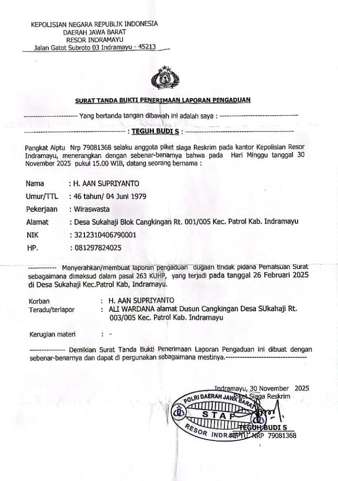 Berkaitan dengan dilaporkanya AW Ke Polres Indramayu H. Aan Supriyanto. SH Kuwu Desa Sukahaji Kamis (29/01/2026) saat di konfirmasi Awak media mengatakan, benar saya melaporkan AW ke Polres Indramayu.Sesuai Tanda Bukti Penerimaan Laporan Pengaduan Di Reskrim Polres Indramayu Tanggal 30 November 2025.