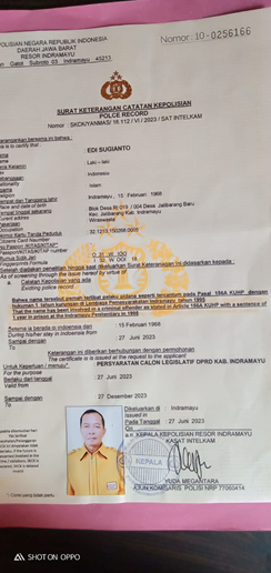 INI DIA Surat Keterangan Kepolisian Nama Edi Sugianto Calon DPRD Indramayu Partai Hanura Pernah Terlibat Pidana