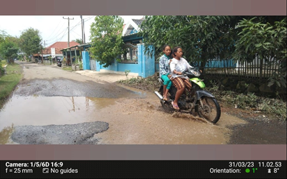 SORANA.CO.ID-INDRAMAYU JAWA BARAT:Tampak dalam gambar pengemudi sepeda motor ekstra hati-hati lewati jalan rusak dan rusak di Desa Drunten Wetan Kecamatan Gabus Wetan Kabupaten Indramayu Jawa Barat-Jumat (31/3/2023).