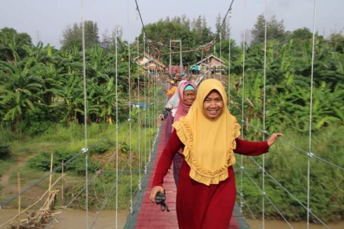 SORANA.CO.ID-INDRAMAYU JABAR: Keberadaan Jembatan Gantung yang berlokasi di Blok Ludoyong, Kecamatan Terisi, Kabupaten Indramayu tidak disangka banyak diungkapkan masyarakat sangat membantu aktivitas sehari-hari dan perekonomian masyarakat setempat.Roni warga Blok Ludoyong mengakui, dengan adanya jembatan gantung sangat membantu dirinya dalam bekerja sebagai kurir pengantar barang online dan mengantar anaknya pergi sekolah yang kini dirasakannya tidak mesti memutar yang jaraknya hampir 2 kilometer.