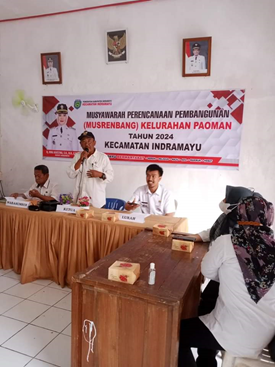 Sebagai penanggungjawab Kepala Kelurahan  Paoman  Mukhammad Arip Pramana Iwa Putra S.STP,Ketua Musrenbang Tariman SE ( Sekretaris Kelurahan Paoman ,hadir elemen masyarakat dengan pemaparan dari Narasumber instansi vertikal Adi Duryadi UPTD DPKPP Indramayu ,AIDA  UPTD PLKB Indramayu , LIA  UPTD Pertanian. Musrenbang berjalan tertib,aman dengan usulan partisipatif tokoh kelembagaan masyarakat ,RT/RW dengan harapan usulan program dan kegiatan diakomodir dan bermanfaat dalam menyukseskan pembangunan menuju Bermartabat Indramayu-(soarana.co.id//ras/ind/grt)
