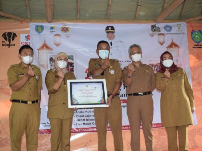 Bupati Indramayu Nina Agustina menyerahkan langsung penghargaan desa wisata untuk Desa Cangkingan, Desa Ujunggebang dan Desa Cikawung pada kegiatan Bazar Kampung Ramadhan belum lama ini di Desa Cangkingan, Kecamatan Kedokanbunder, Kabupaten Indramayu.