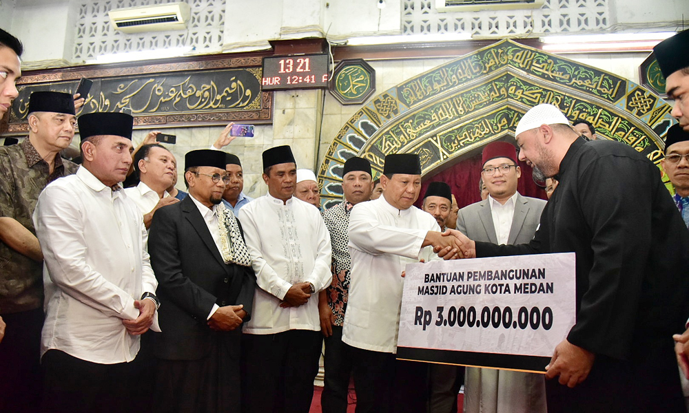 SORANA.CO.ID-MEDAN SUMUT:Menteri Pertahanan (Menhan) Republik Indonesia Prabowo Subianto menyerahkan bantuan Rp3 Miliar untuk pembangunan Masjid Agung Sumatera Utara (Sumut). Bantuan dana ini akan dipergunakan untuk pembangunan tahap ketiga Masjid Agung.
