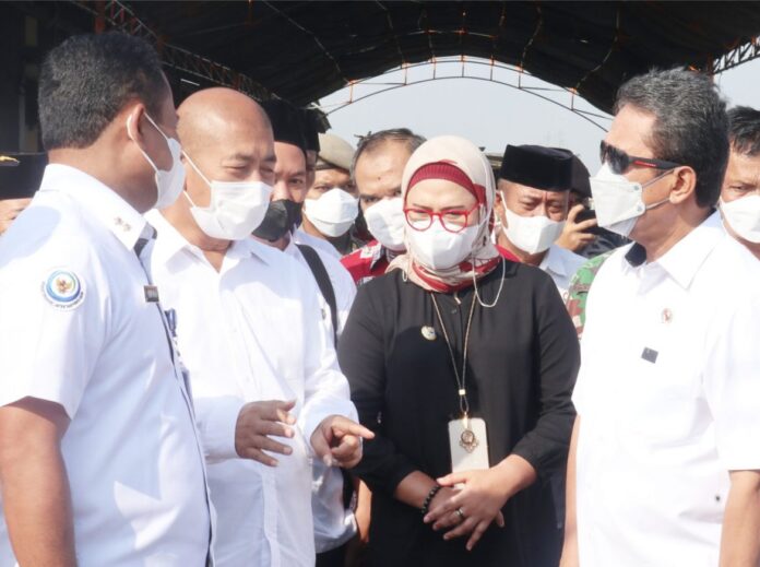 Bupati Indramayu Nina Agustina Da’i Bachtiar mendampingi Menteri Kelautan dan Perikanan (KKP) Sakti Wahyu Trenggono untuk meninjau dan menampung aspirasi masyarakat nelayan di Pangkalan Pendaratan Ikan (PPI) Dadap Kecamatan Juntinyuat, Kabupaten Indramayu, Kamis (14/4/2022).