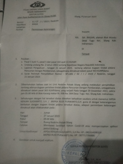 Bermula dari kekadian tersebut, keduanya menjelaskan ihwal dirinya dilaporkan ke polsek dengan Nomor LP : B/07/I/2023/Reskrim, tanggal 21 Januari 2023 untuk dimintai keterangan atas tuduhan pasal 363 KUHPidana, dugaan tindak pidana pencurian dengan pemberatan.
