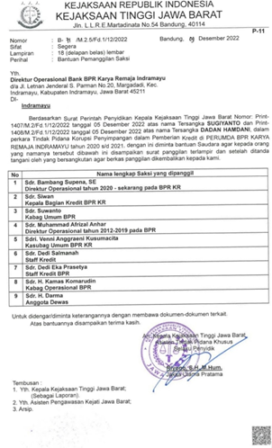 Hasil penyelidikan dan Penyidikan Kejaksaan Tinggi Jawa Barat. Dugaan sementara ,ditetapkan jadi tersangka dua orang tersangka. Jabatan Direktur Perumda BPR -KR. bernisial Sg.hasil.penetapan Kuasa Pemilik modal.( KPM).atau Bupati Indramayu dan seorang debitur muda ngaku pengusaha ,ini sial DM.total kredit kisaran Rp.34 M.macet.Kedua tersangka ini diharapkan akan membuka tabir korupsi dugaan melanda BPR plat merah Kabupaten Indramayu.