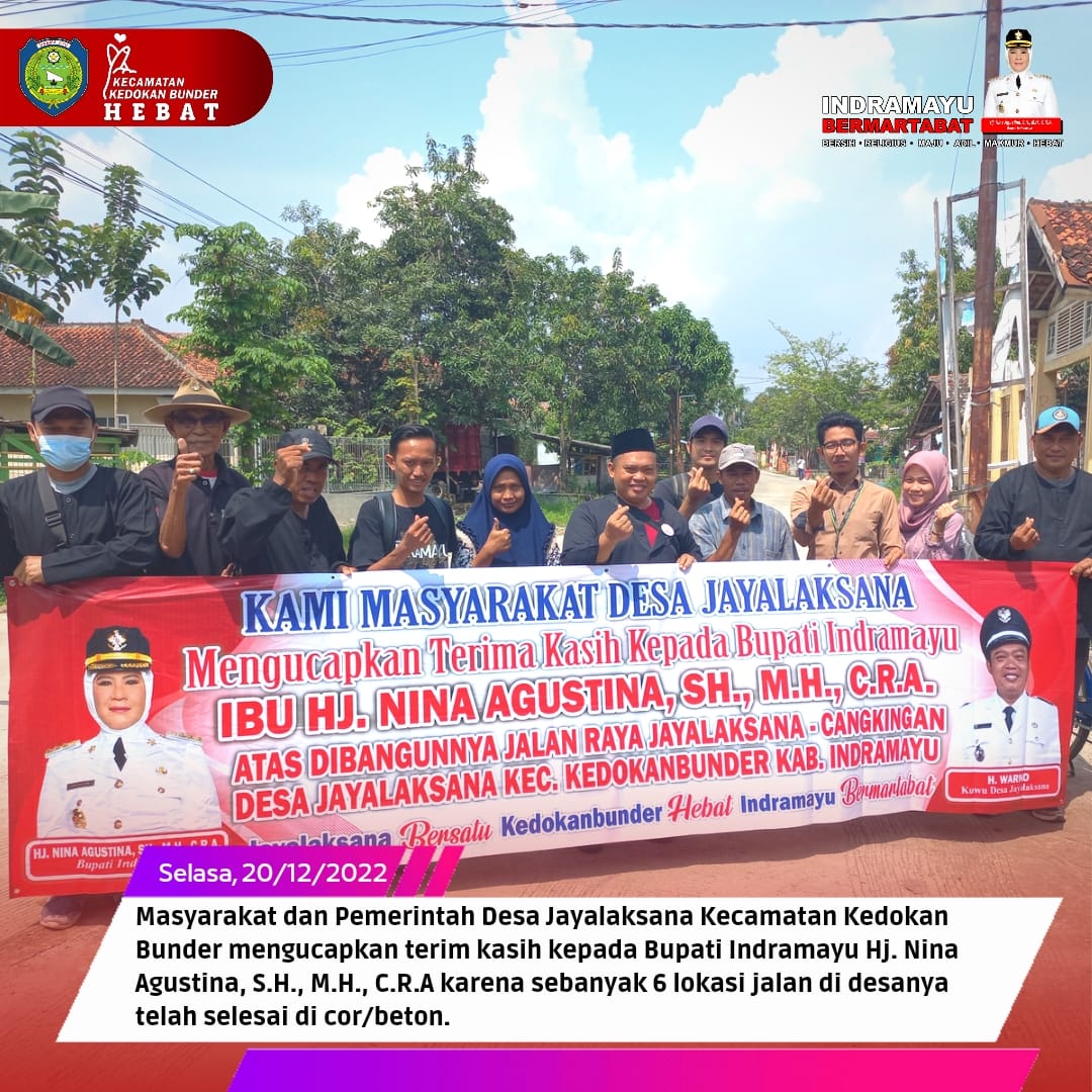 Hal tersebut ditegaskan Kuwu Jayalaksana H. Warno ketika memonitor jalan di desanya bersama dengan Camat Kedokanbunder Atang Suwandi, pada Selasa (20/12/2022).Warno menambahkan, pada kesempatan itu atas nama pemerintah maupun masyarakat Desa Jayalaksana, dirinya mengucapkan terima kasih atas berbagai pembangunan yang telah dilaksanakan di desanya.“Alhamdullah jalan Jayalaksana yang menghubungkan dengan Cangkingan telah selesai dilaksanakan. Terima kasih kepada Bupati Indramayu Hj. Nina Agustina, S.H., M.H., C.R.A. Semoga ini terus berkelanjutan,” tegas Kuwu Warno.