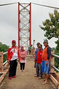 SORANA.CO.ID-INDRAMAYU JAWA BARAT:Pengerjaan jembatan gantung yang menjadi penghubung antara desa Bondan Kecamatan Sukagumiwang dengan Desa Gadel Kecamatan Tukdana diprediksikan akan selesai pada akhir Pebruari nanti.Untuk memastikan pekerjaan berjalan lancar. Camat Sukagumiwang Suratno Sukarja melaksanakan monitoring pengerjaan jembatan gantung pada Jumat (27/01/2023).