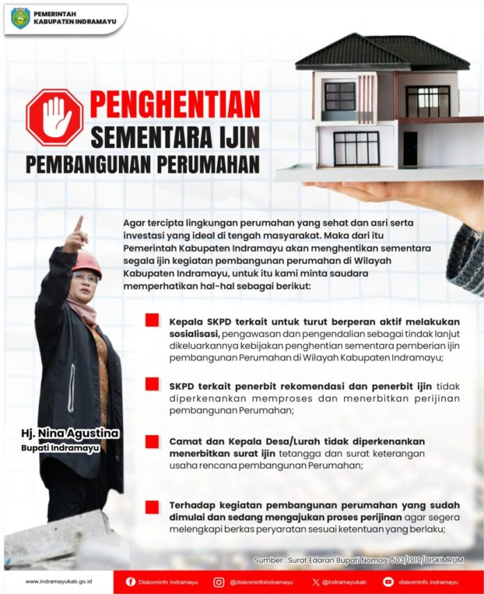 Menurut Bupati Indramayu Nina Agustina melalui Kepala Dinas Perumahan, Kawasan Permukiman, dan Pertanahan (Diskimrum) Erpin Marpinda menjelaskan, beberapa point penting dalam surat edaran tersebut yakni para kepala SKPD terkait harus turut berperan aktif untuk melakukan sosialisasi, pengawasan dan pengendalian, sebagai tindak lanjut dikeluarkannya kebijakan penghentian sementara pembangunan perumahan tersebut.