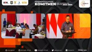 Kegiatan penandatanganan komitmen aksi pencegahan korupsi 2023/2024 turut dihadiri Kepala Staf Kepresidenan, Moeldoko, Menteri Koordinator bidang Perekonomian, Airlangga Hartarto, Menteri Koordinator bidang Hukum dan Hak Asasi Manusia, Yasonna H. Laoly, Menteri Lingkungan Hidup dan Kehutanan, Siti Nurbaya Bakar, Menteri Perhubungan, Budi Karya Sumadi, Menteri Investasi/Badan Koordinasi Penanaman Modal Bahlil Lahadalia, serta pemerintah provinsi dan kabupaten kota yang mengikuti kegiatan secara daring.source Diskominfo-fikri ## (sorana.co.id//ras//par/grt)