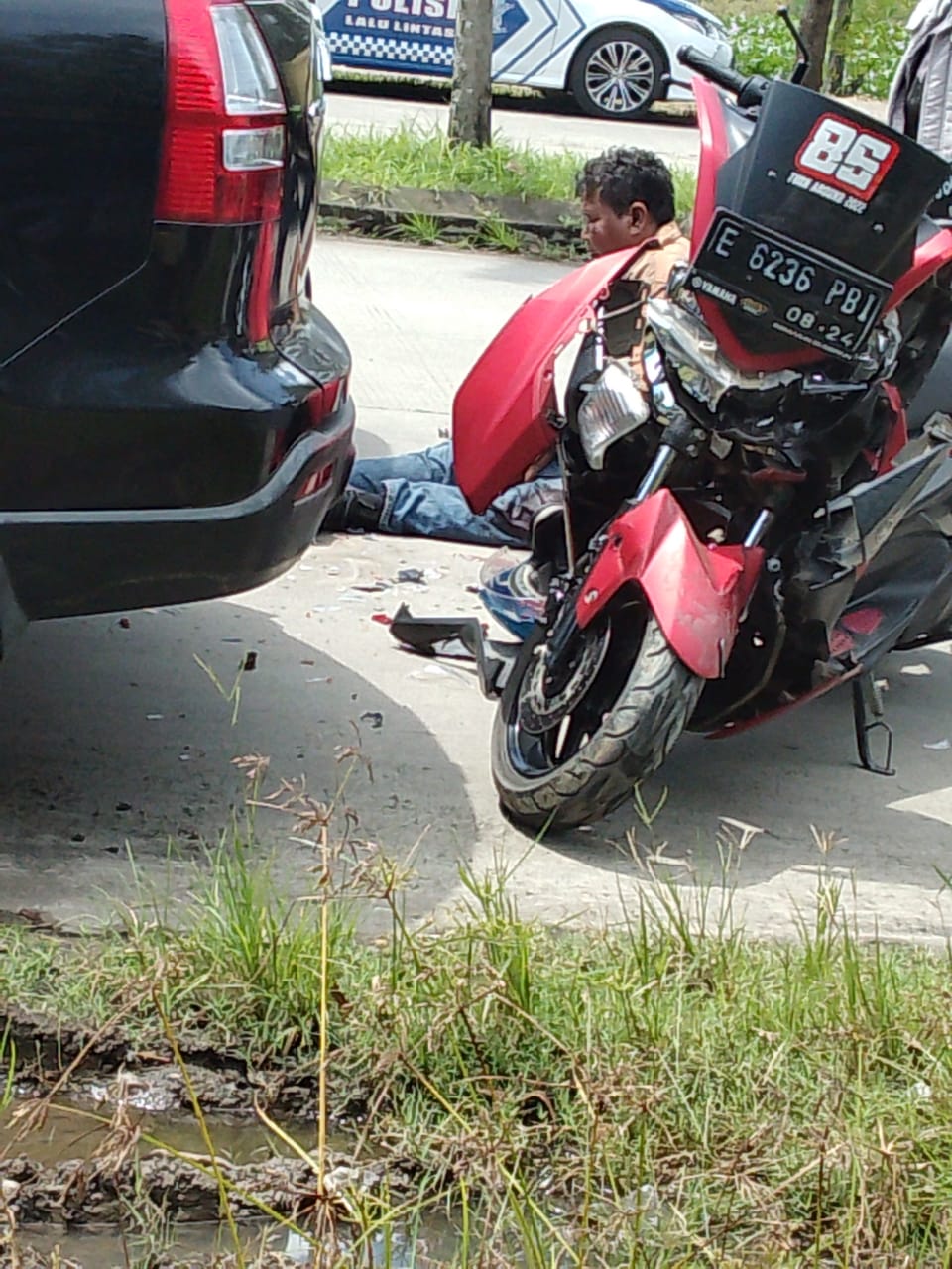 SORANA.CO.ID-INDRAMAYU JAWA BARAT:Terjadi  kecelakaan lalu-lintas tabrakan antara pengendara motor dengan mobil di depan Kantor Samsat Jln Gatot Subroto Kecamatan Indramayu Kabupaten Indramayu Jawa Barat, Selasa (7/3/2023).