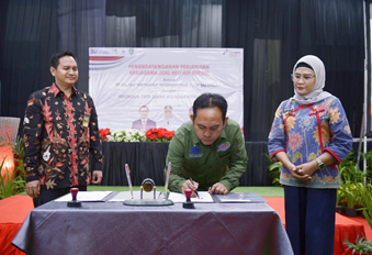 SORANA.CO.ID-INDRAMAYU JAWA BARAT:Bupati Indramayu, Hj. Nina Agustina., SH., MH., CRA., turut menyaksikan acara penandatanganan kerjasama antara Perumdam Tirta Darma Ayu Indramayu dengan PT. Kilang Pertamina Internasional RU VI Balongan di Gedung Patra Ayu Perumahan Pertamina Bumi Patra, Indramayu, Kamis (15/12/2022).