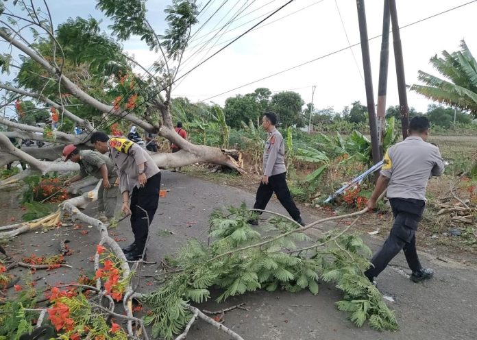 SORANA.CO.ID-INDRAMAYU JAWA BARAT:Polsek Gabuswetan, jajaran Polres Indramayu Polda Jabar melakukan evakuasi pohon tumbang yang menghalangi Jalan PU Saradan – Wanguk di Desa Babakanjaya Blok Babakan Dampyang. Kejadian tersebut terjadi pada Senin, 4 Desember 2023, sekitar pukul 13.30 WIB.