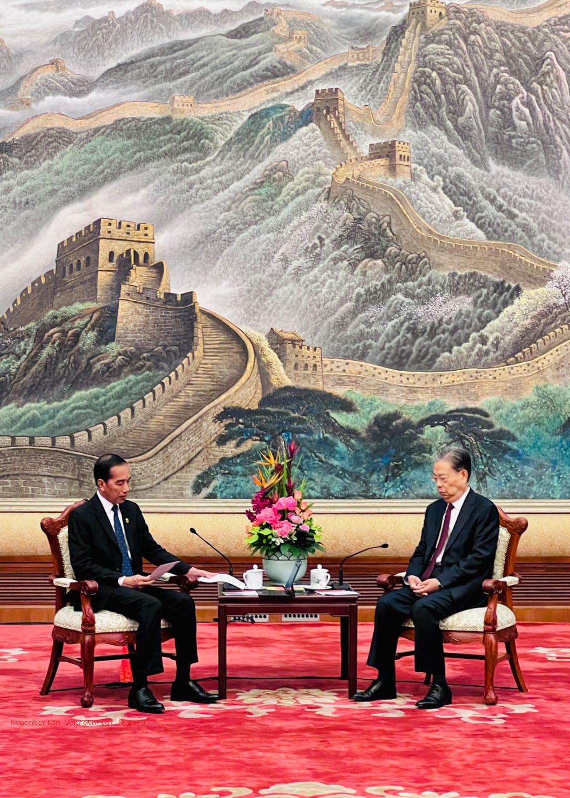 SORANA.CO.ID-RRT TIONGKOK:Presiden Joko Widodo melakukan pertemuan bilateral dengan Ketua Kongres Rakyat Nasional Republik Rakyat Tiongkok (RRT) Zhao Leji pada Rabu, 18 Oktober 2023, di Great Hall of The People, Beijing. Pertemuan tersebut digelar di sela-sela pelaksanaan Konferensi Tingkat Tinggi (KTT) ke-3 Belt and Road Forum (BRF) for International Cooperation.