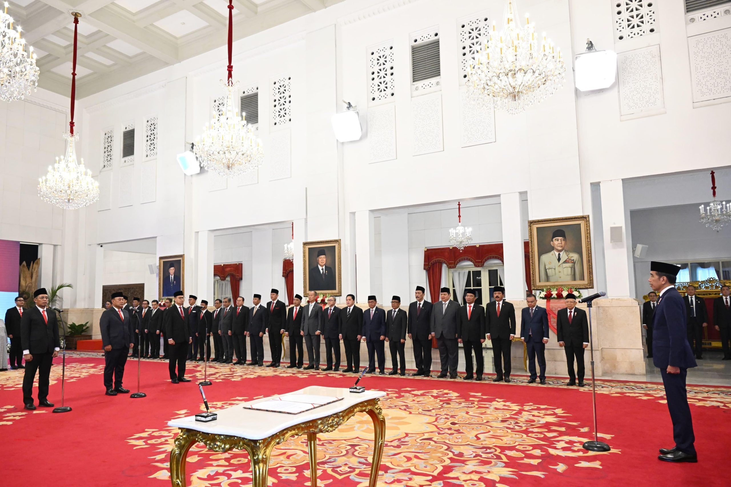Tampak hadir pula Menteri BUMN Erick Thohir, Menteri Perdagangan Zulkifli Hasan, Menteri Perindustrian Agus Gumiwang Kartasasmita, Menteri Komunikasi dan Informatika Budi Arie Setiadi, Menteri Agraria dan Tata Ruang/Badan Pertanahan Nasional Agus Harimurti Yudhoyono, Menteri Hukum dan HAM Supratman Andi Agtas, Menteri Investasi/Kepala BKPM Rosan Perkasa Roeslani, Menteri ESDM Bahlil Lahadalia, dan Ketua Dewan Pertimbangan Presiden Wiranto.Source BPMI nSetpres-BPMI-(sorana.co.id//ras/@rewi)