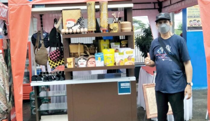 Berbagai hasil kerajinan tangan tampak terpajang apik di Booth ekraf Posko Bermartabat seperti tas rajut, sepatu, anyaman bambu, lampu tidur, sampai topeng khas Indramayu.