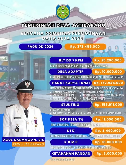Dukungan operasional Koperasi Desa Merah Putih.Ketahanan Pangan – Rp 3.000.000Penguatan pangan desa.Dengan pengelolaan yang terbuka dan tepat sasaran, Dana Desa 2026 diharapkan mampu mendorong Jatibarang yang berwibawa, santun, dan mandiri.Source Kota Jatibarang (Kab. Indramayu)-(www.sorana.co.id//ras/litsus)