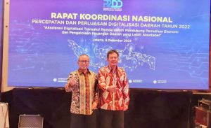 SORANA.CO.ID-INDRAMAYU JAWA BARAT: Bupati Indramayu Nina Agustina melalui Sekretaris Daerah (Sekda) Indramayu Rinto Waluyo bersama Staf Ahli Bidang Ekonomi, Keuangan dan Pembangunan Suwenda menghadiri Rapat Koordinasi Nasional (Rakornas) Percepatan dan Perluasan Digitalisasi (P2DD) Tahun 2022.Bertempat di Ballroom Hotel Le Meridien Jakarta, Selasa (6/12/2022). Rakornas P2DD Tahun 2022 ini mengangkat tema