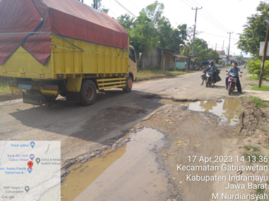 SORANA.CO.ID-INDRAMAYU JAWA BARAT:Kondisi status jalan Kabupaten mulai dari Kecamatan Gabus Wetan tepatnya jalan raya Desa Gabus Wetan Menuju Karangsinom rusak berat dan lebih berhati-hati ketika lintas jalan tersebut karena kondisi rusak berlobang,belum ada tindakan untuk perbaikan dari pihak Dinas PUPR Kabupaten Indramayu Jawa Barat-Senin (17/4/2023)-(sorana.co.id//ras/shb/@foto:m nurdiansyah)