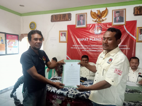 SORANA.CO.ID-INDRAMAYU JAWA BARAT:Panitia Pemungutan Suara (PPS) Desa Sumberjaya Kecamatan Kroya Kabupaten Indramayu melaksanakan rapat pleno rekapitulasi Daftar Pemilih Hasil Pemutakhiran yang digunakan pada pemilihan Pemilu Dan Presiden dan Wakil Presiden tahun 2024 yang akan di selenggarakan tanggal 4 Pebruari 2024.Dilaksankan tempat di Sekretariat PPS Desa / Balai Desa Sumberjaya, kegiatan ini dihadiri oleh Kepala Desa, Ketua PPS,PPK,Panwas Tingkat Desa (PKD). Kamis ,(30/3/2023)